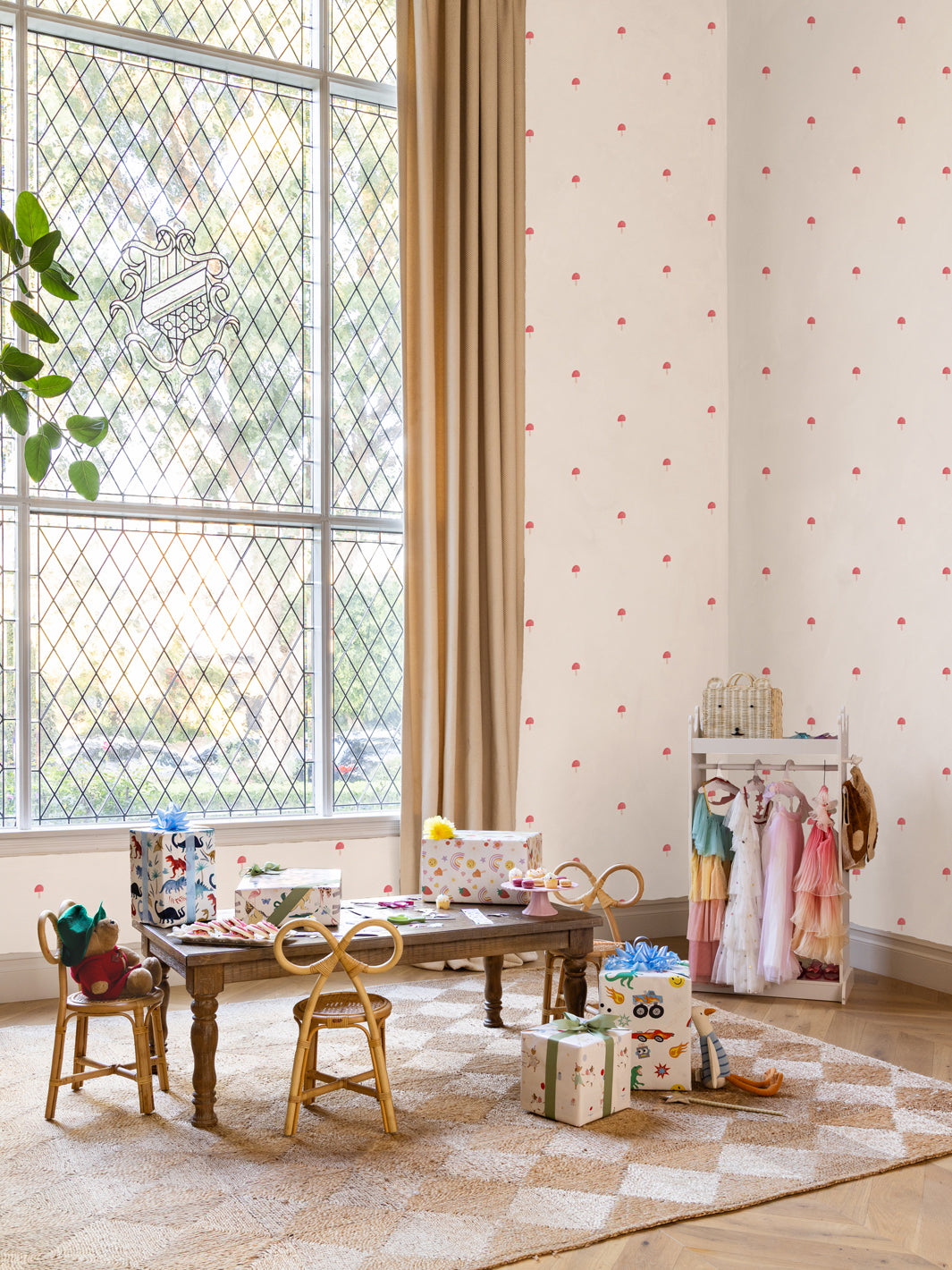 Inspired by the joyful chaos of a well-loved playroom, this Toybox gift wrap brings together all the classics in one playful pattern. Illustrated with monster trucks, race cars, robots, dinosaurs, rainbows, lightning bolts, and smiley faces, the design feels energetic, imaginative, and endlessly fun. The crisp white background keeps the look clean and modern, letting the colorful motifs shine without overwhelming.