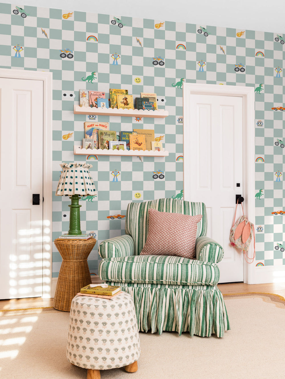 'Toybox Check' Wallpaper by Meri Meri - Seafoam